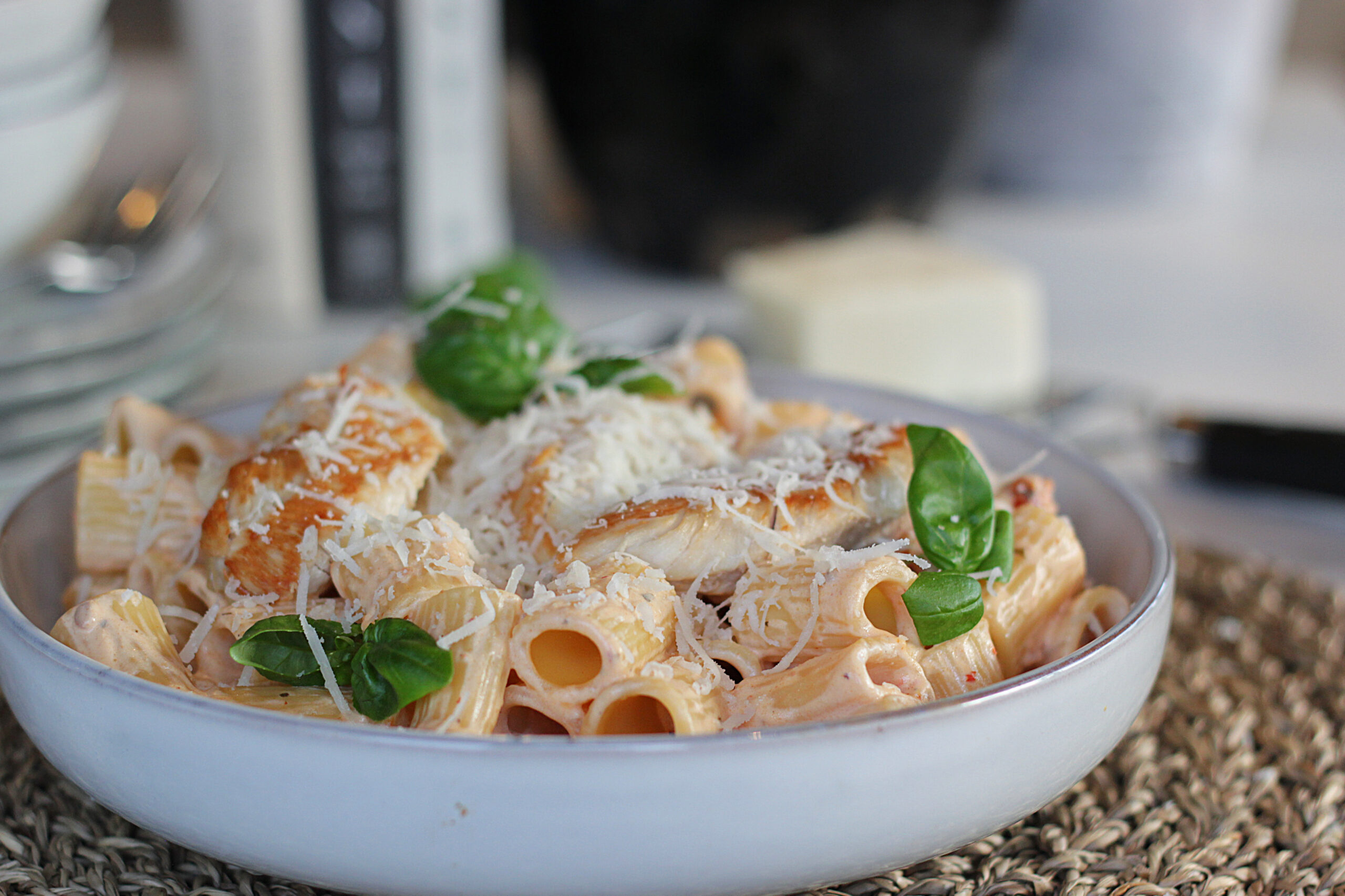 Einstaklega gott kjúklingapasta með krydduðum rjómaostum sem tekur einungis 30 mínútur að elda og bera fram fyrir fjölskylduna er eitthvað sem við öll þurfum. Hægt að skipta kjúklingnum út fyrir t.d. risarækjur og bera fram með brauði.