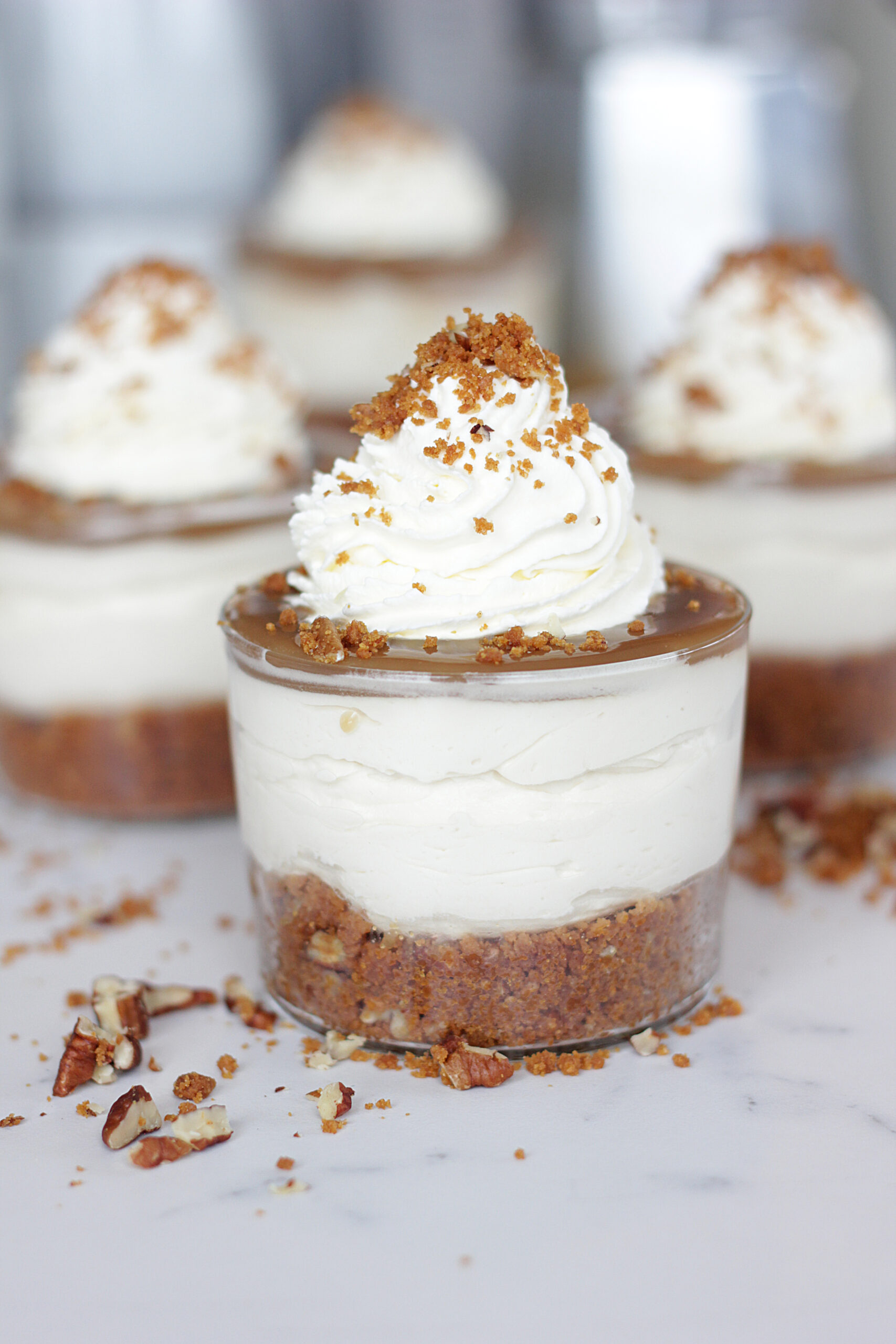 Hver elskar ekki að geta borið fram ljúffenga ostaköku í glasi sem ekki þarf mikla fyrirhöfn. Þessi ostakaka tekur enga stund að útbúa, karamellan en einstaklega góð á móti ostakökunni og stökkum botni með piparkökum og pekanhnetum. Ekkert mál að gera daginn áður.