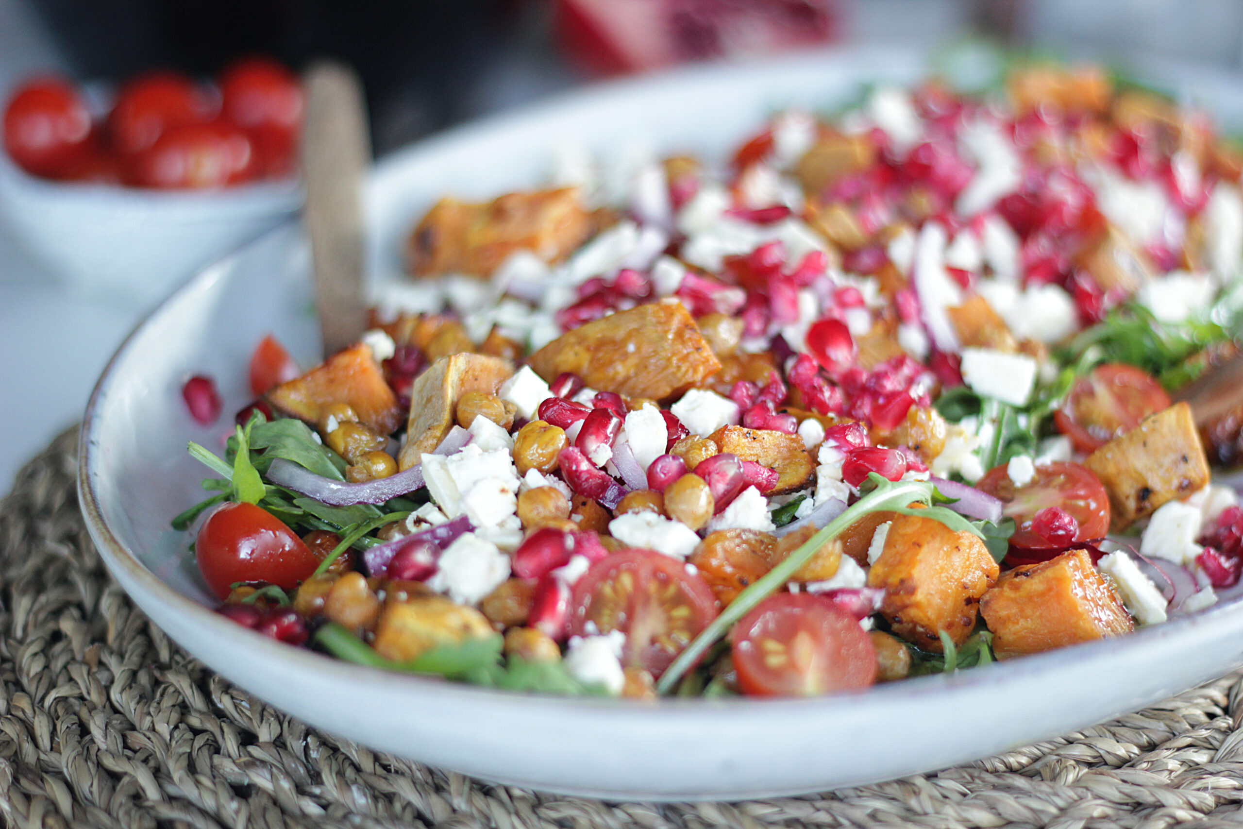 4. Setjið klettasalat í skál eða fat. Setjið sætkartöflublönduna ofan á ásamt niðurskornum tómötum, rauðlauk og granatepli. Skerið ostakubbinn smátt niður og dreifið honum vel yfir salatið.